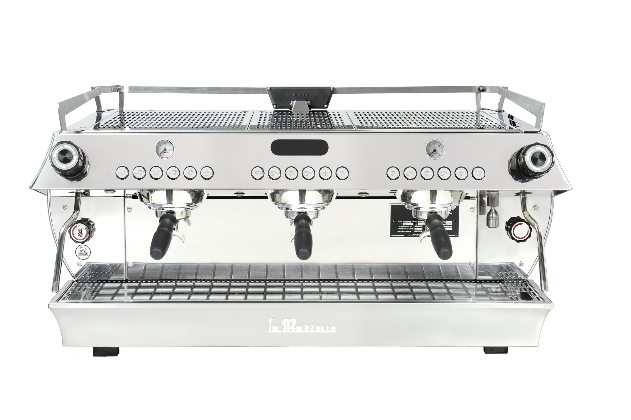 Lieferumfang: 3 Doppelsiebträger, La Marzocco Tamper, Reinigungsmittel, Blindsieb, Siebeinsätze 17g. Standardausführung: Tropfgitter mit erhöhter Tassenablage.
