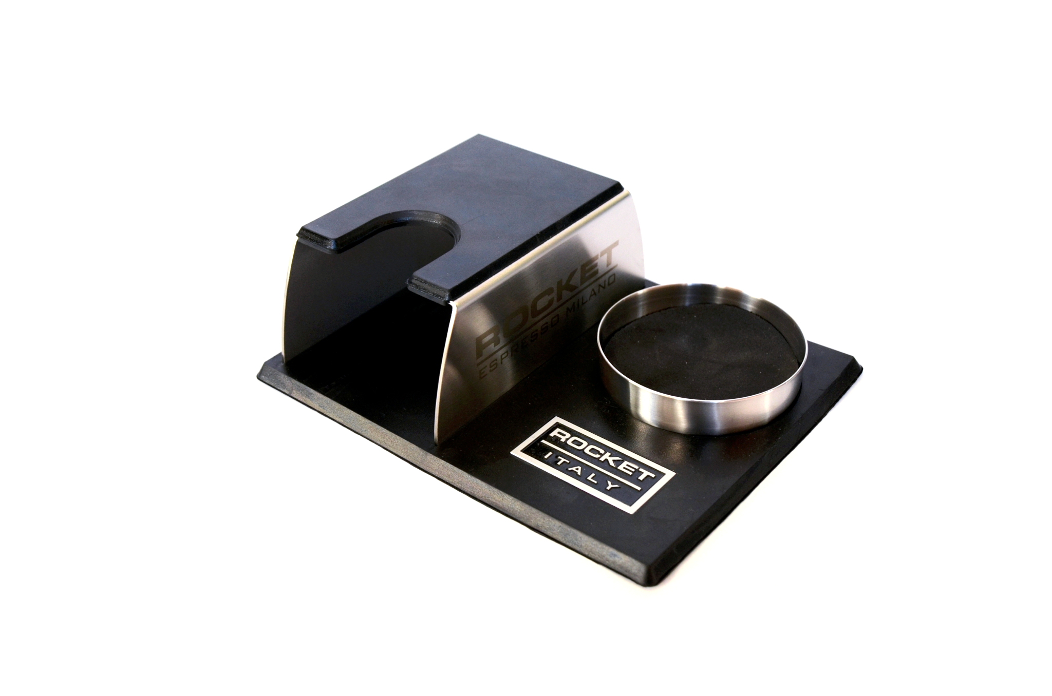 Dieses gebrandete, original Rocket-Espresso Zubehör verfügt über einen separaten Platz zur Positionierung des Tampers.